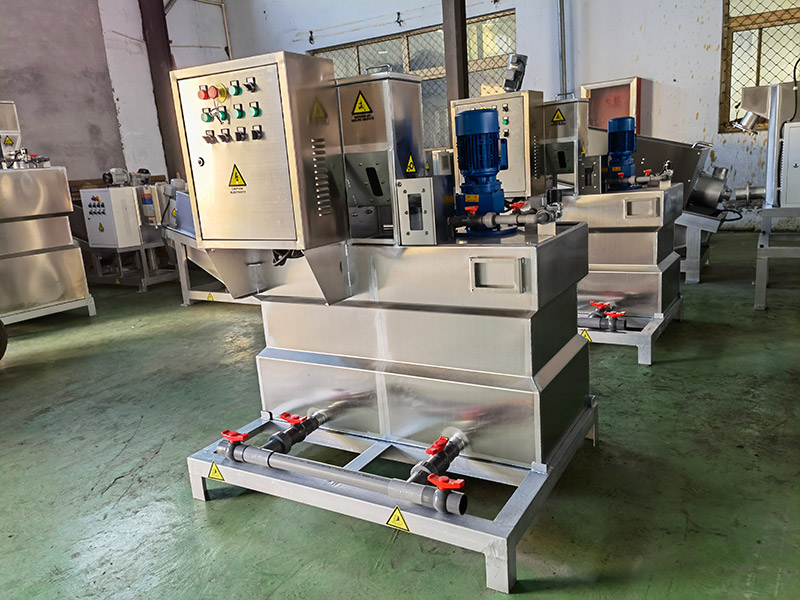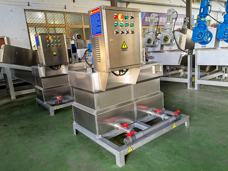絮凝劑干粉倒入干粉進(jìn)料機(jī)的料斗,通過(guò)改變進(jìn)料電機(jī)3的轉(zhuǎn)速來(lái)精確控制進(jìn)藥量。干粉由投配螺旋經(jīng)過(guò)輸料管推入到混合器中,輸料管的電熱帶能使里面的干粉避免受潮結(jié)塊堵塞輸料管。進(jìn)入混合器中的干粉立刻被稀釋水潤(rùn)濕,并滑入制備格,制備格中有一個(gè)緩緩轉(zhuǎn)動(dòng)的電動(dòng)攪拌器,初步混和藥液,然后藥液再流入熟化格,在其內(nèi)充分混和并熟化,熟化后的藥液,流入投配格中,為防止熟化的藥液發(fā)生沉淀,投配格中的攪拌器在停止制備藥液時(shí)進(jìn)行間歇攪拌。