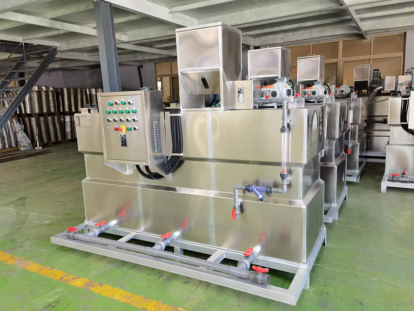 PAM自動(dòng)泡藥機(jī)通過(guò)各個(gè)溶液槽分級(jí)逐步完成泡藥。溶液槽之間隔離,保證每個(gè)溶液槽內(nèi)的最佳反應(yīng)時(shí)間和恒定濃度,S線連通配置。自動(dòng)控制系統(tǒng)與儲(chǔ)存槽上的液位控制器相連,一旦液位達(dá)到低位,機(jī)器會(huì)自動(dòng)打開進(jìn)水電磁閥,啟動(dòng)干粉機(jī)投加干粉絮凝劑。當(dāng)液位達(dá)到最高點(diǎn)時(shí),設(shè)備會(huì)自動(dòng)停止進(jìn)水和加藥。